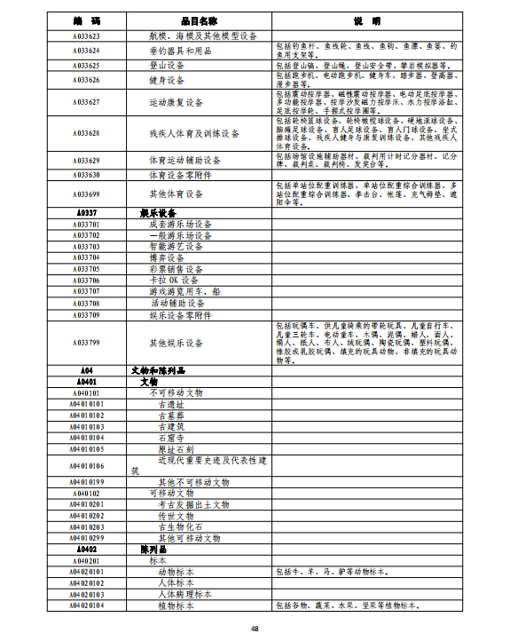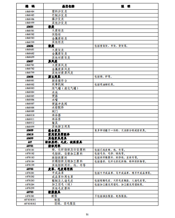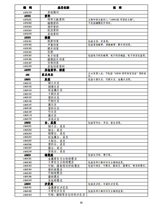 货物类:在“A0605 柜类”下细化了“A060501木质柜类”和“A060503 金属质柜类”,同时删除“文件柜”。在“A0606 架类”下细化了“A060601木质架类”、“A060602 金属质架类”、“A060699 其他材质架类”。在“A0607 屏风类”下细化了“A060701 木质屏风类”、“A060702 金属质屏风类”、“A060799 其他材质屏风类”。
