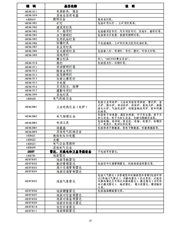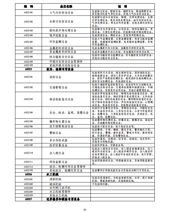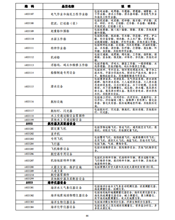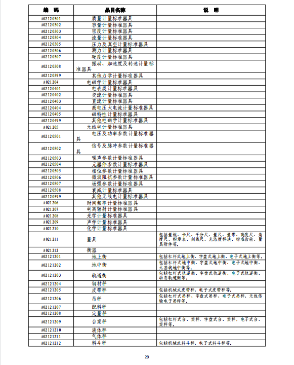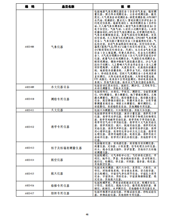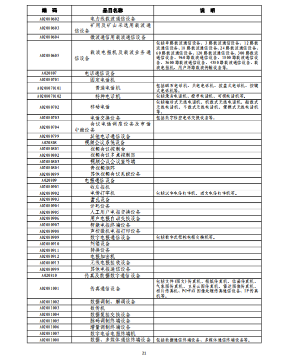 包 括 “ A0202050101 数 字 照 相 机 ”、“ A02052305 空调机组 ”、 “A0206180203 空调机”、“A02070105 地面气象雷达”、“A020714 卫星遥感 设备”、“A02080102 移动通信(网)设备”、“A020812IP 与多媒体通信设备”、 “A032504 安全、检查、监视、报警设备”、“A033408 气象仪器”、“A06 家具用具”、“B08 修缮工程”、“C0602 展览服务”、“C0803 审计服务”、“C0811 建筑物清洁服务”、“C0901 技术测试和分析服务”、“C1002 工程勘探服务”、 “C1005 工程项目管理服务”、“C1203 房地产中介服务”、“C1204 物业管理 服务”、“C150401 人寿保险服务”、“C15040299 其他财产保险服务”、 “C170401 水上旅客运输服务”、“C170402 水上货物运输服务”、“C210202 林木抚育管理服务”等品目。
