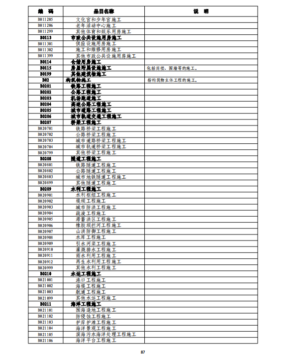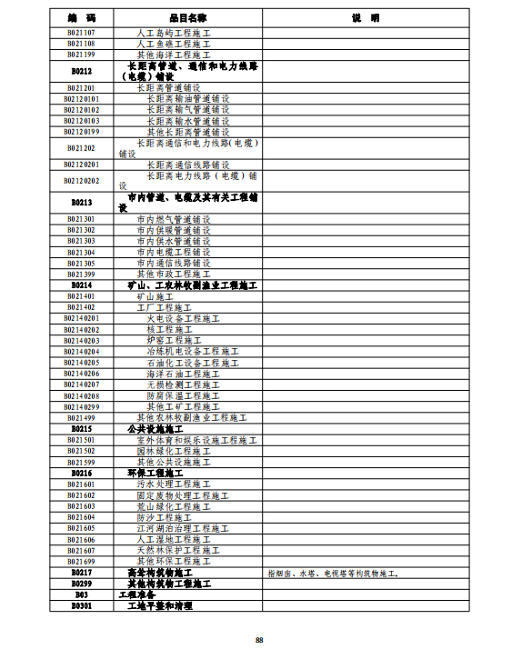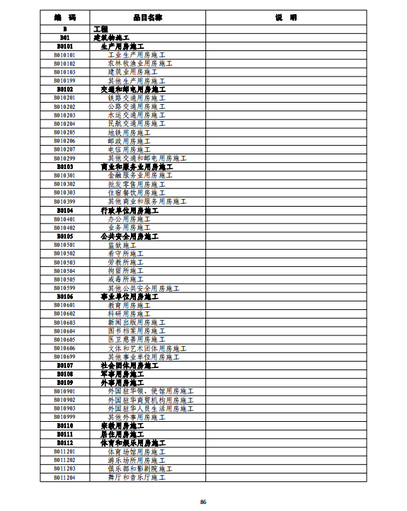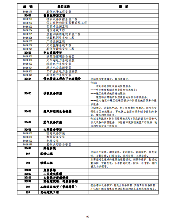 工程类:在“B0601 电子工程安装”下细化了“B060101 雷达、导航和测控系统工程安装”、“B060102 监控系统工程安装”、“B060103 电子自动化工程安装”、“B060104 电子设备工程安装”、“B060199 其他电子工程安装”。在“B0602 智能化安装工程”下细化了“B060201 楼宇设备自控系统工程”、“B060202 保安监控和防盗报警系统工程”、“B060203 智能卡系统工程”、“B060204 通信系统工程”、“B060205 卫星和共用电视系统工程”、 “B060206 计算机网络系统工程”、“B060207 广播系统工程”、“B060208 火灾报警系统工程”、“B060299 其他智能化安装工程”。在“B0603 电力系统安装”下细化了“B060301 建筑物照明设备安装”、“B060302 火车站电力系统安装”、“B060303 机场电力系统安装”、“B060304 港口电力系统安装”、 “B060305 工矿企业电力系统安装”、“B060399 其他电力系统安装”。