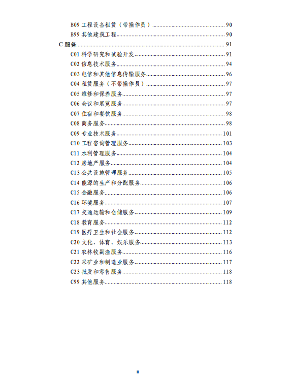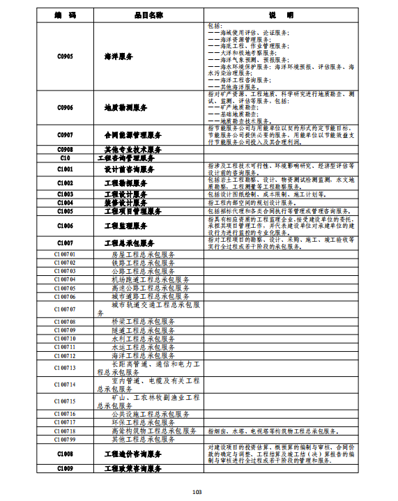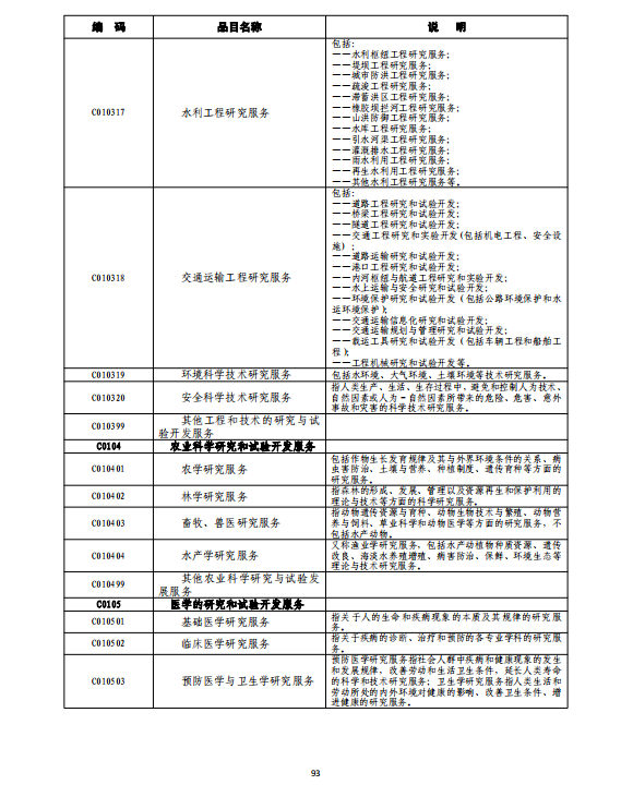 服务类:在“C0103 工程学的研究和试验开发”下细化了“C010301 工程和技术基础科学研究服务”、“C010302 测绘科学技术研究服务”、“C010303 材料科学研究服务”、“C010304 冶金工程技术研究服务”、 “C010305 机械工程研究服务”、“C010306 化学工程研究服务”、“C010307 纺织科学技术研究服务”、“C010308 食品科学技术研究服务”、“C010309 矿山工程技术研究服务”、“C010310 动力与电力工程研究服务”、“C010311 能源科学技术研究服务”、“C010312 核科学技术研究服务”、“C010313 电子、 通信与自动控制技术研究服务”、“C010314 计算机科学技术研究服务”、 “C010315 航空、航天科学技术研究服务”、“C010316 土木建筑工程研究服 务”、“C010317 水利工程研究服务”、“C010318 交通运输工程研究服务”、 “C010319 环境科学技术研究服务”、“C010320 安全科学技术研究服务”、“C010399 其他工程和技术的研究与试验开发服务”。在“C0104 农业科学 研究和试验开发服务”下细化了“C010401 农学研究服务”、“C010402 林学研究服务”、“C010403 畜牧、兽医研究服务”、“C010404 水产学研究服务”、 “C010499 其他农业科学研究与试验发展服务”。在“C0105 医学的研究和试验开发服务”下细化了“C010501 基础医学研究服务”、“C010502 临床医学研究服务”、“C010503 预防医学与卫生学研究服务”、“C010504 军事医学 与特种医学研究服务”、“C010505 药学研究服务”、“C010506 中医学与中药学研究服务”、“C010599 其他医学研究与试验发展服务”。