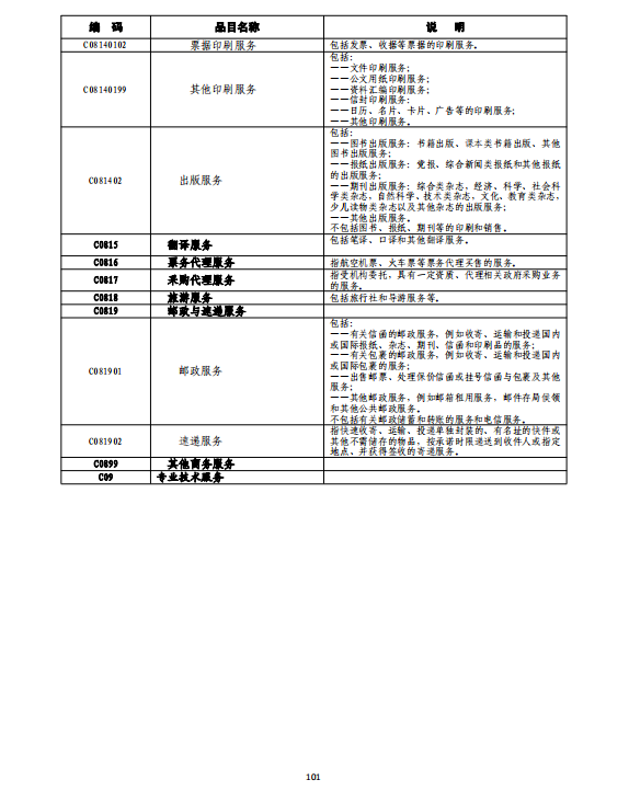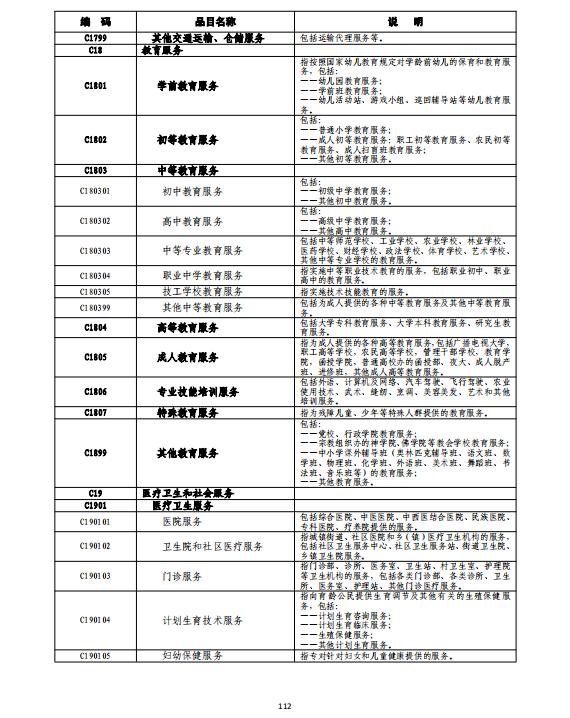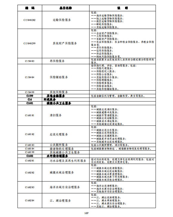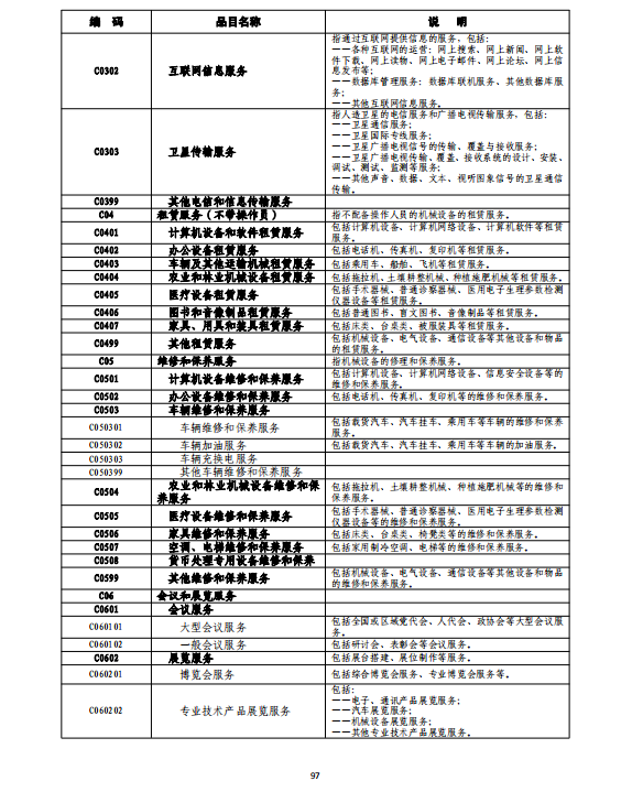 服务类:在“C0503 车辆维修和保养服务”下增设“C050303 车辆充换电服务”,在“C05 维修和保养服务”下增设“C0508 货币处理专用设备维修和保养”,在“C10 工程咨询管理服务”下增设“C1008 工程造价咨询服务”和“C1009 工程政策咨询服务”,“C1009 工程政策咨询服务”增设 “C100901 水利工程政策咨询服务”、“C100902 交通运输工程政策咨询服 务”、“C100999 其他工程政策咨询服务”,在“C1901 医疗卫生服务”下增设“C190107 健康检查服务”。