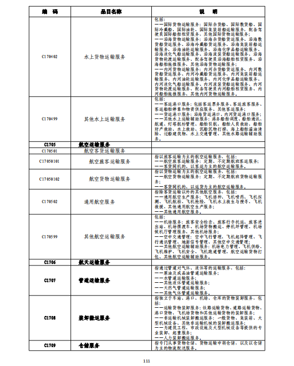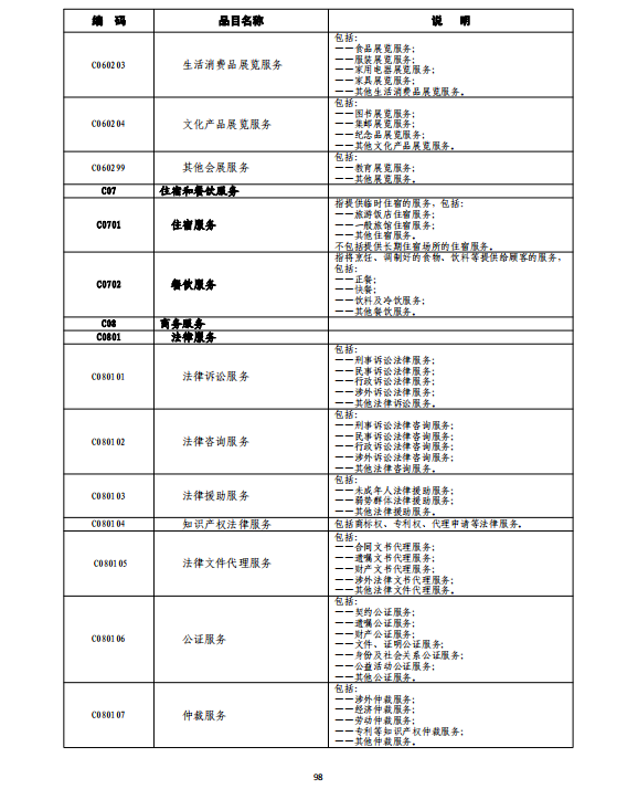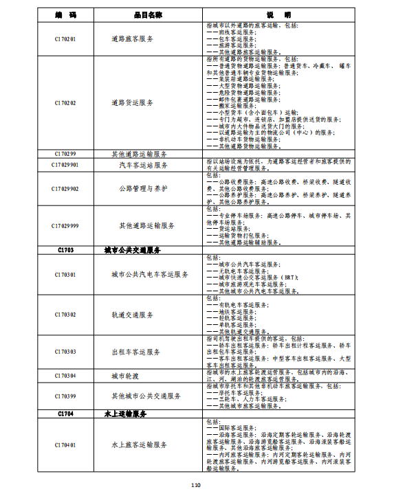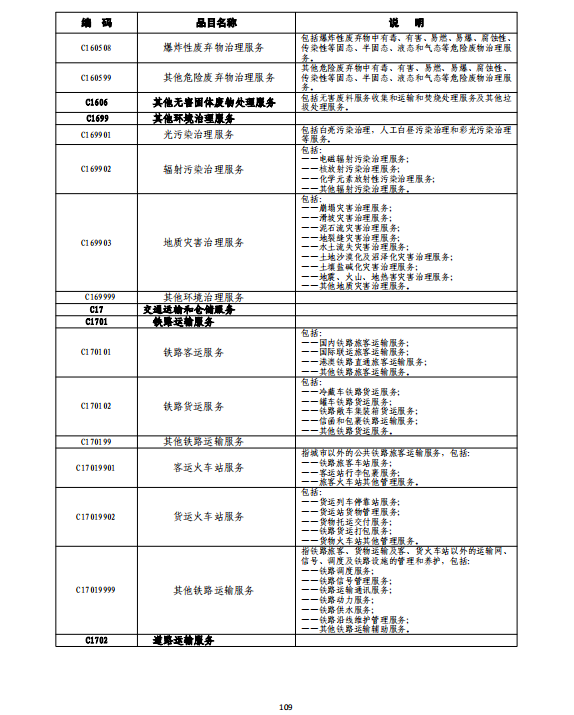 服务类:将“法律咨询服务”在“C0801 法律服务”下的位置往前调整,将“铁路运输辅助服务”调整为“C170199 其他铁路运输服务”,将“公路旅客服务”调整为“C170201 道路旅客服务”,将“道路运输辅助服务” 调整为“C170299 其他道路运输服务”,将“客运汽车站服务”调整为 “C17029901 汽车客运站服务”,将“公共电汽车客运服务”调整为“C170301 城市公共汽电车客运服务”,将“航空运输辅助服务”调整为“C170599 其他航空运输服务”,将“森林病虫害防治服务”调整为“C210204 林业有害 生物防治服务”。