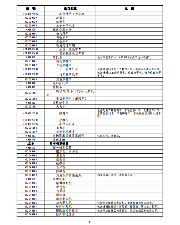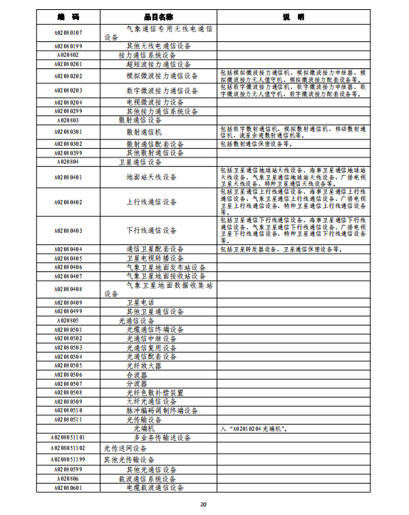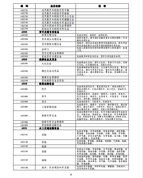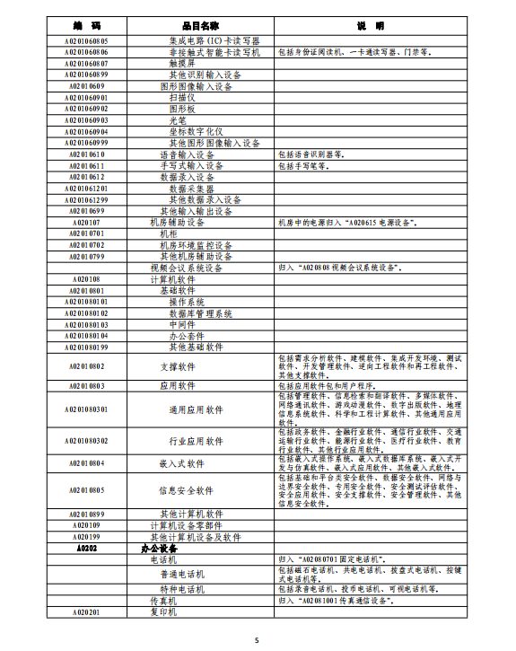货物类:将“光端机”上升一个层级,作为“A020102 计算机网络设备”的下级品目;将“光传输设备”从“A020102 计算机网络设备”调整到“A020805 光通信设备”,同时增加“A0208051102 光传送网设备”和“A0208051199 其他光传输设备”;将“船检执法车”调整为“A02030726 海事执法车”,将“卫星定位导航 GPS 设备”调整为“A020713 卫星定位导 航设备”,将“客船及拖船”调整为“A033102 客船”和“A033103 拖船” 独立的两个品目。