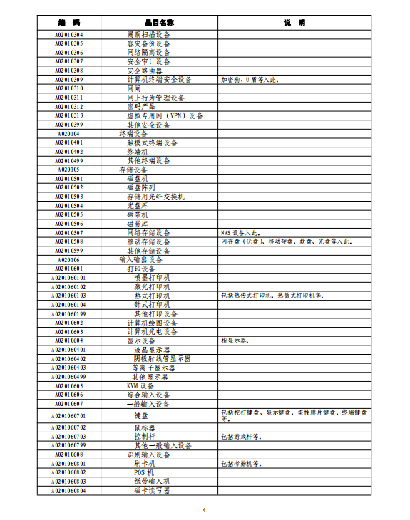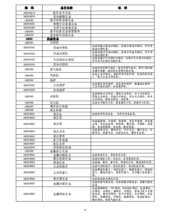 货物类:删除“PC 服务器”、“小型机”、“并行运算服务器”、“单口服务器”和“其他服务器”,归入“A02010103 服务器”。删除“网络 机”、“计算机工作站”,归入“A02010104 台式计算机”。删除“专用数字计算机”,根据计算能力,相应地归入“A0201010101 巨型计算 机”、“A0201010102 大型计算机”、“A0201010103 中型计算机”、 “A02010102 小型计算机”。删除“蒸汽发生器及其零件”,归入 “A020504 锅炉”。