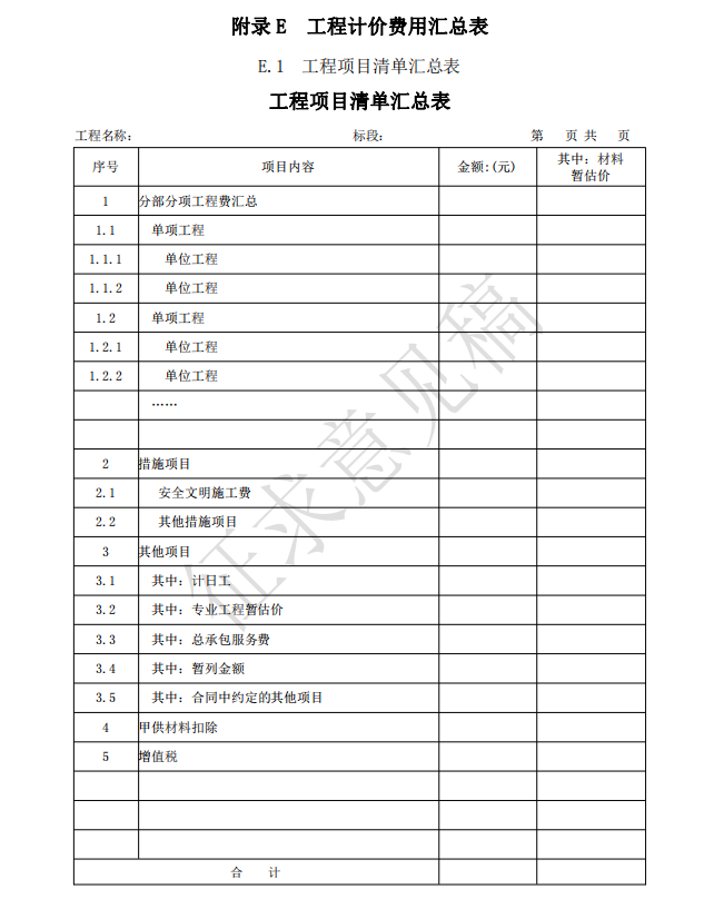 1 工程量清单编制使用表格包括:B.1、C.1、D.1、E.1、E.2、E.3、E.4、E.5-1 或 E.5-2、 E.6、E10、G.1、G.2、G.3、G.4;
